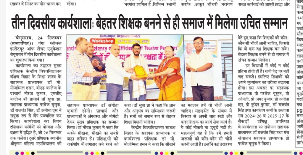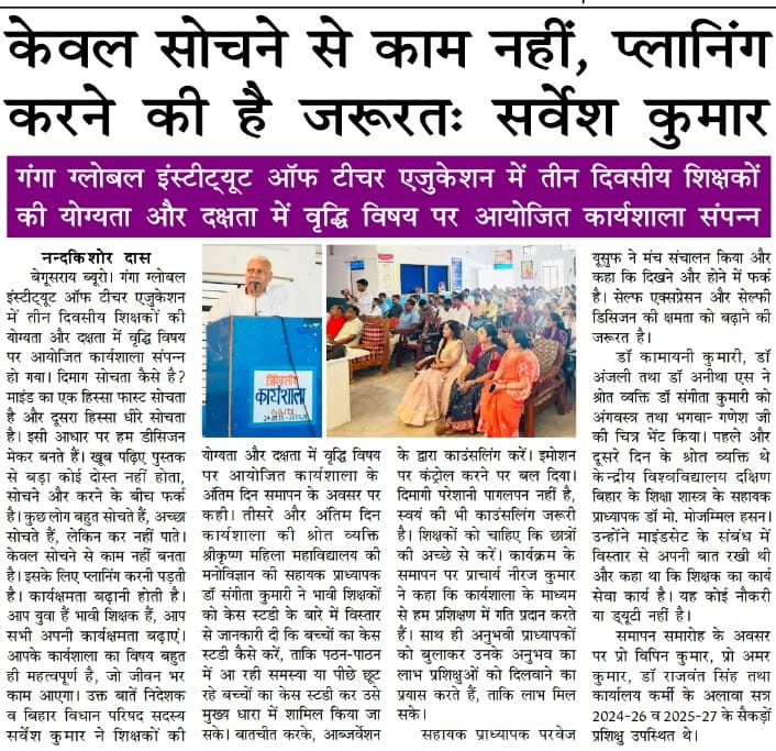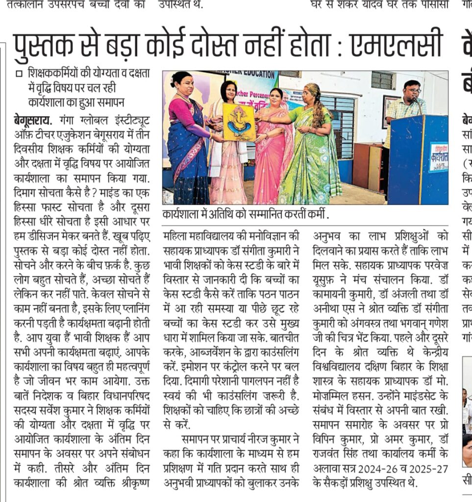 Uncategorized गंगा ग्लोबल इंस्टीट्यूट ऑफ़ टीचर एजुकेशन बेगूसराय में तीन दिवसीय शिक्षक कर्मियों की योग्यता और दक्षता में वृद्धि विषय पर आयोजित कार्यशाला का समापन किया गया February 5, 2026 aaa30kumar